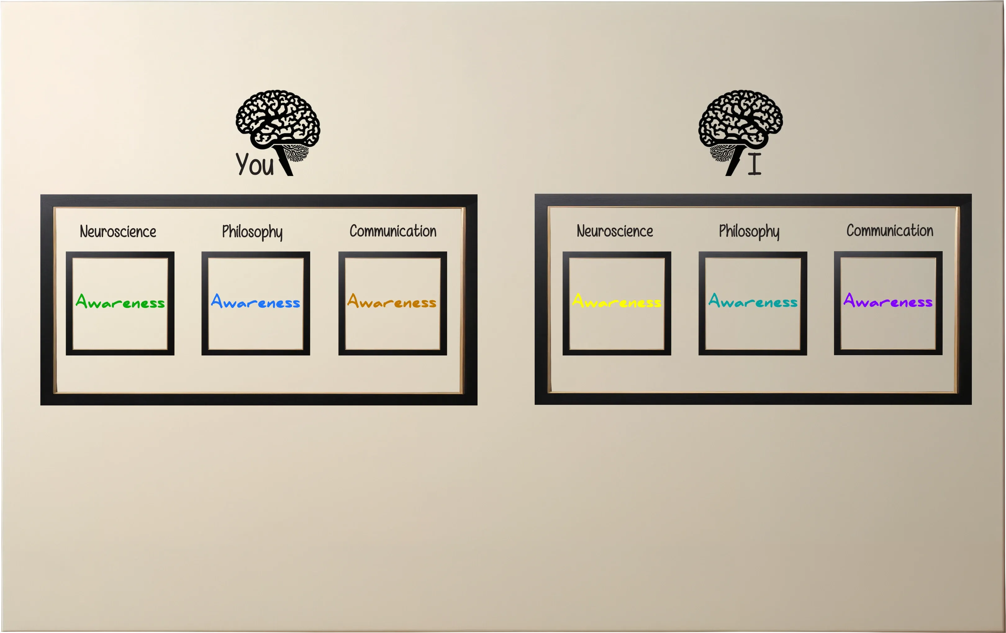 Now, you might wonder: shouldn’t Neuroscience, Philosophy and Communication be framed in different shapes (or colors) as well? After all, they’re probably not exactly the same either — depending on whether the perspective is yours or mine. And of course, You and I are obviously different, making it clear that the context isn’t the same, right?