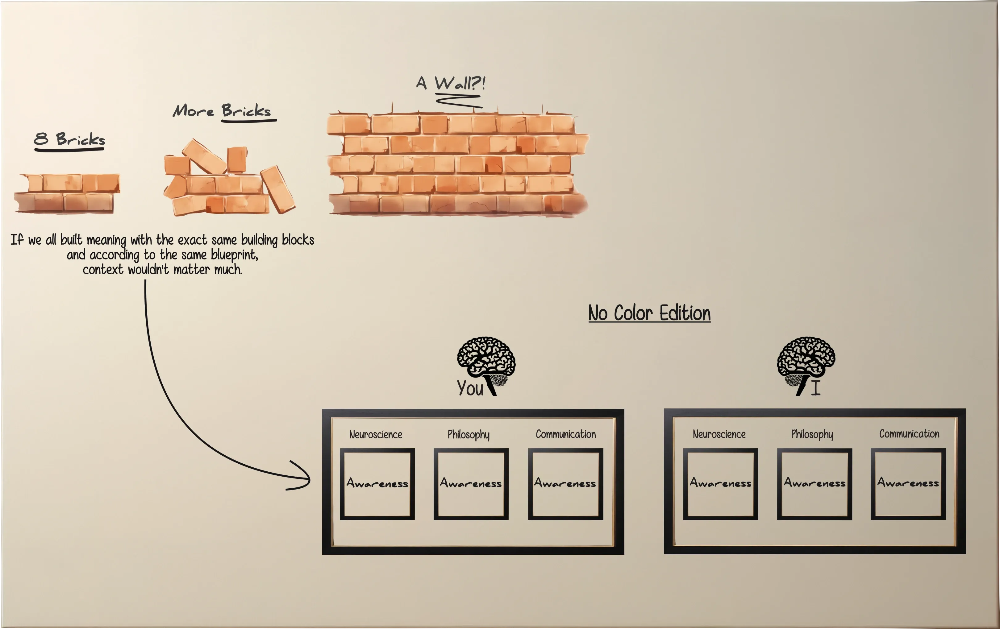 Approaching a concept as depicted in Fig. 2 leads us to assume that we share an identical understanding of the same words. Put simply, imagine that each of one us is building that wall with identical bricks — with brick being a metaphor for word. These bricks come in the exact same atomic structure and there’s only one way to stack them on top of each other. All we gotta do is decide what precise moment can we call our construct a wall. Same with awareness, right? You know…when you’re aware of something. A piece of information stored in our mind and retrievable. Or whatever. And boom! We have a precise moment that turns awareness from a simple brick into a wall.