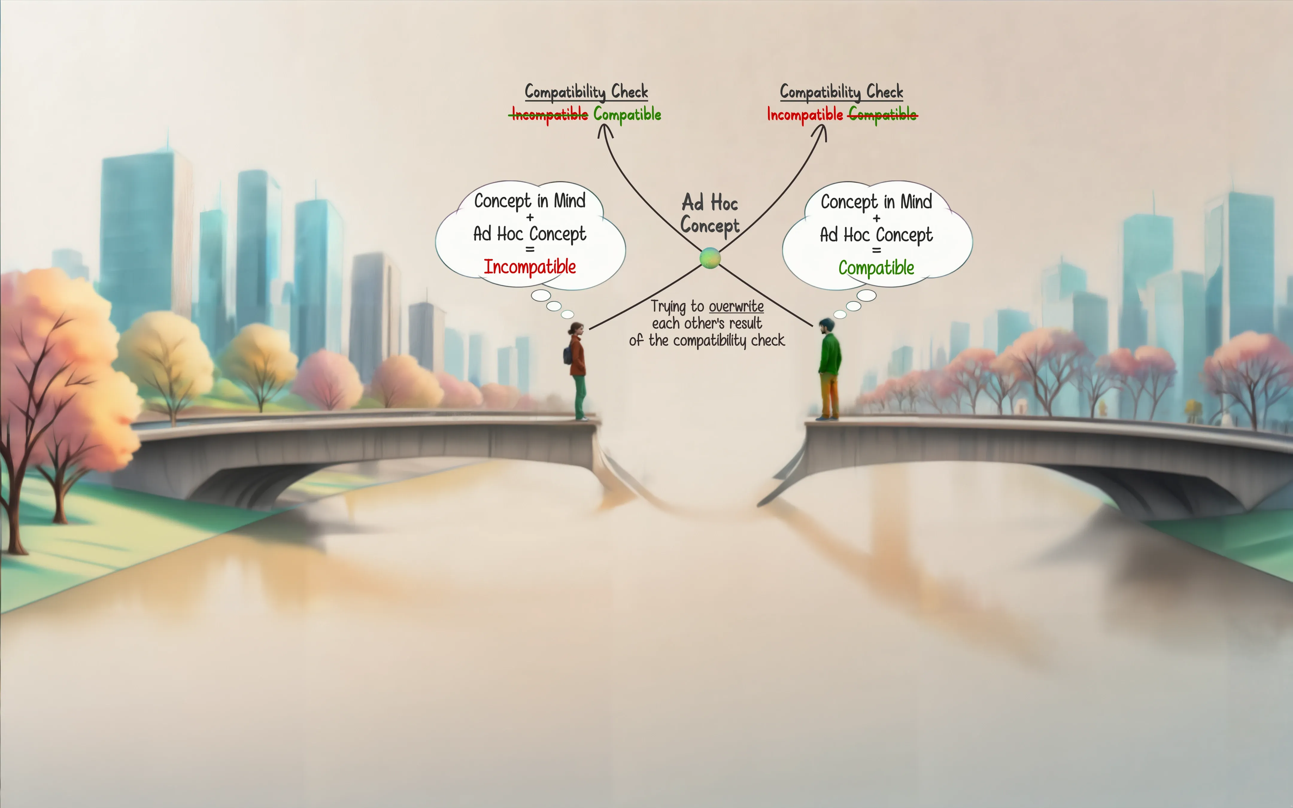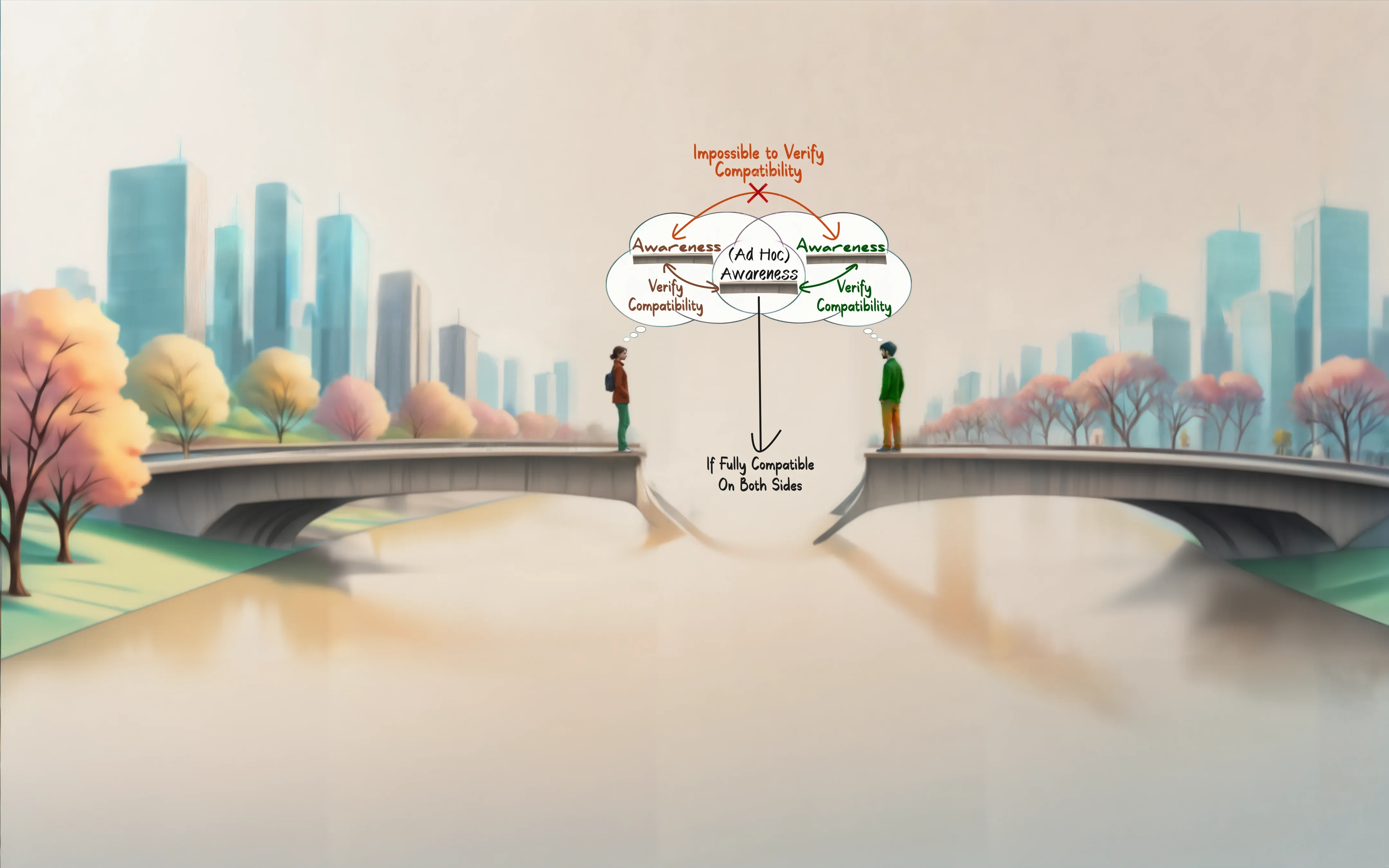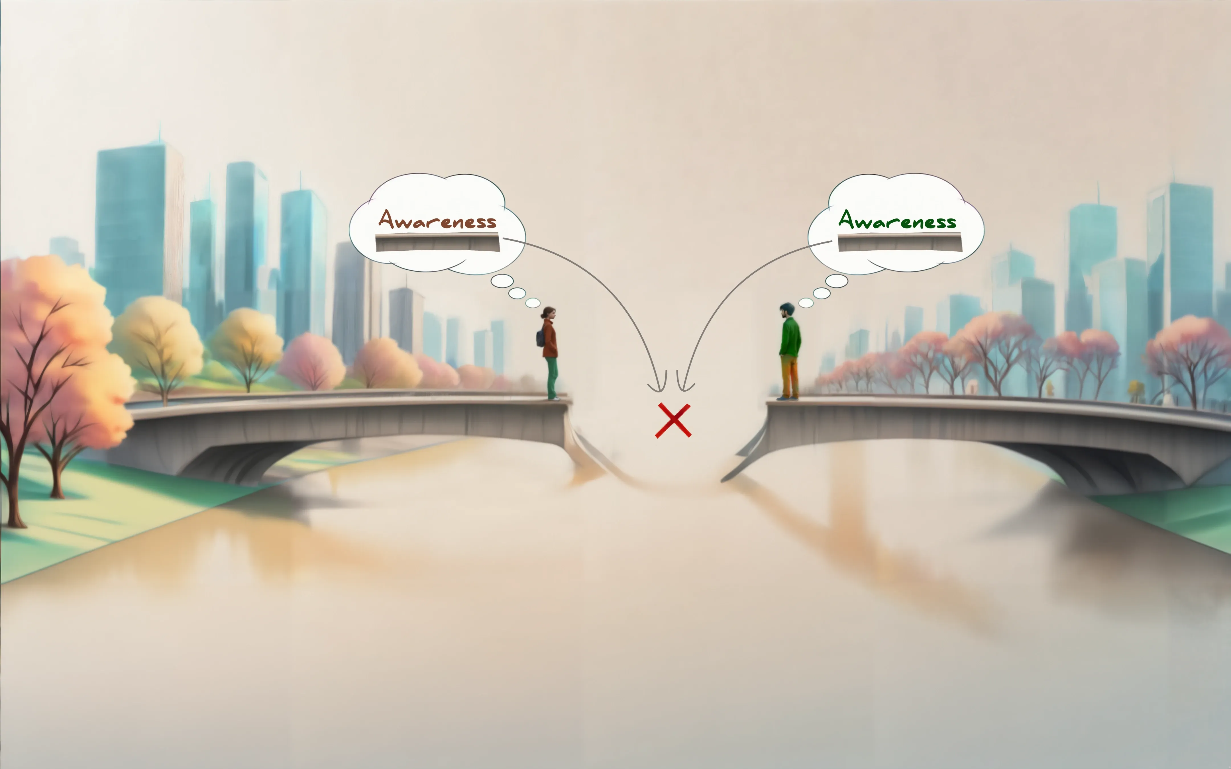 This one is a little tough to explain, but basically: while we share a physical context (outside), we both have our own understanding of awareness — marked by different colors (as initially also illustrated in Fig. 1). The problem, however, is that the physical context isn’t precisely captured by the term outside. There are other things such as noises and smells, different colors we perceive etc. that all have an effect on us as we move along that bridge. So every instant has the potential to slightly alter the color of the bricks or building blocks used to construct our current snapshot of awareness and, thus, its color. In other words, we don’t simply store linguistic building blocks in our mind™ where they remain static until we retrieve them. Instead, these blocks affect one another and are in a dynamic relationship with whatever we experience, learn etc. — and that includes the act of communicating with one another. Put simply, as things stand right now, we won’t be able to meet on that bridge.