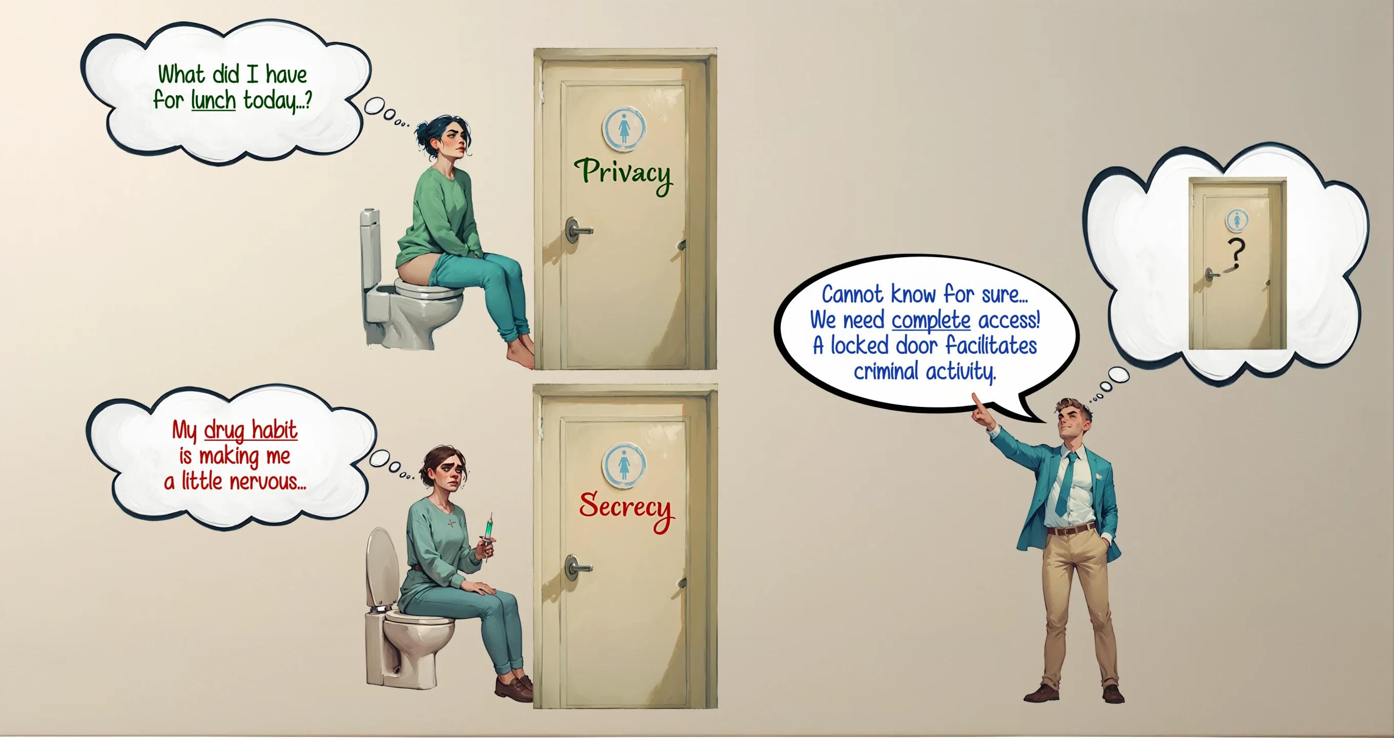 Fig. 10 can easily be summarized with words such as persuasion, but it is a little more than that. It is an attempt to successfully convey what’s on our mind™ — and by successfully I mean: if we express the same concepts with the same words, we are more likely to assume that we understand them in the same way. However, simply building concepts with the same words isn’t a guarantee for linguistic precision. Think about it: if both of us are using nothing to hide as a building block for privacy, we have established a common ground, but our language still has secrecy as a more precise fit for nothing to hide. In other words, there’s a missed opportunity for improved precision. This leads us to having a hard time deciding whether going to the bathroom pertains to a basic human need or a potential crime. And that’s just one example.