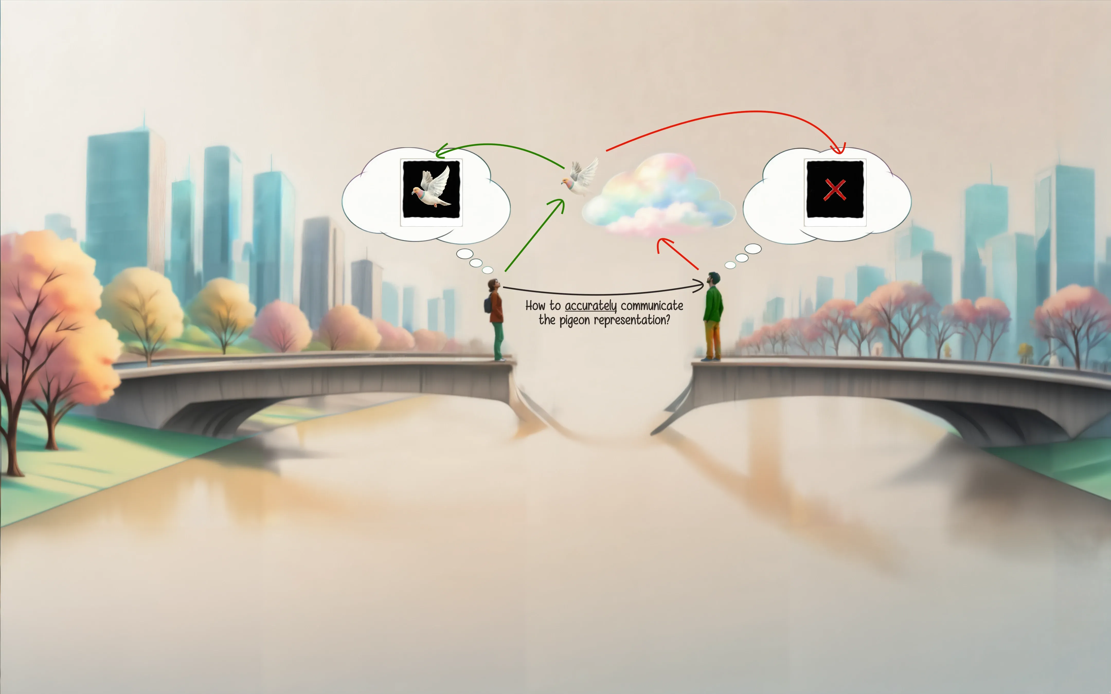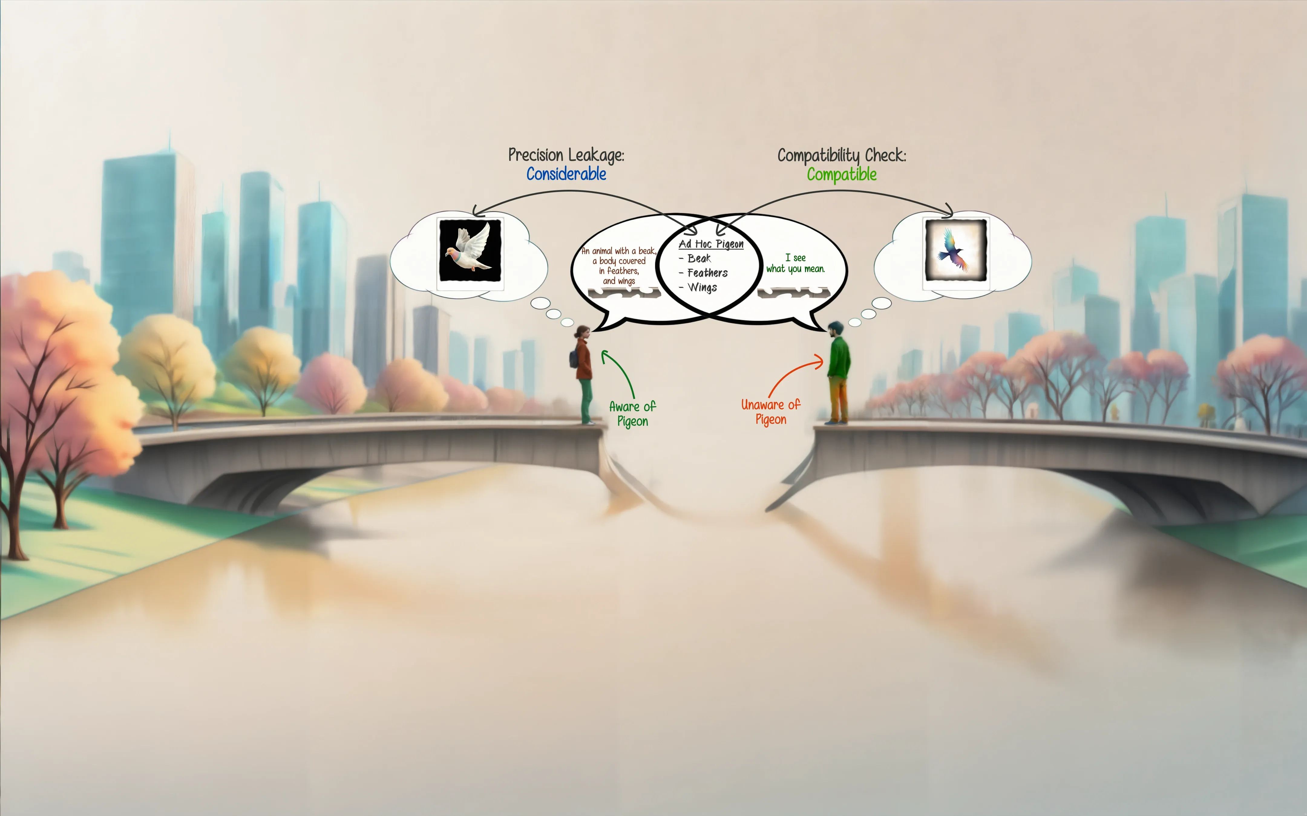 The first step: the person on the left visualizes and describes a pigeon (specific) and the one on the right uses that description and ends up visualizing a bird (generic) as he doesn’t have a specific representation of what a pigeon is — at least not the representation of a pigeon the person on the left has. The man, however, has an understanding of its features and can put them together to form something that is good enough to connect the bridge between them. I guess they’re having a verbal exchange without trying to kill each other.