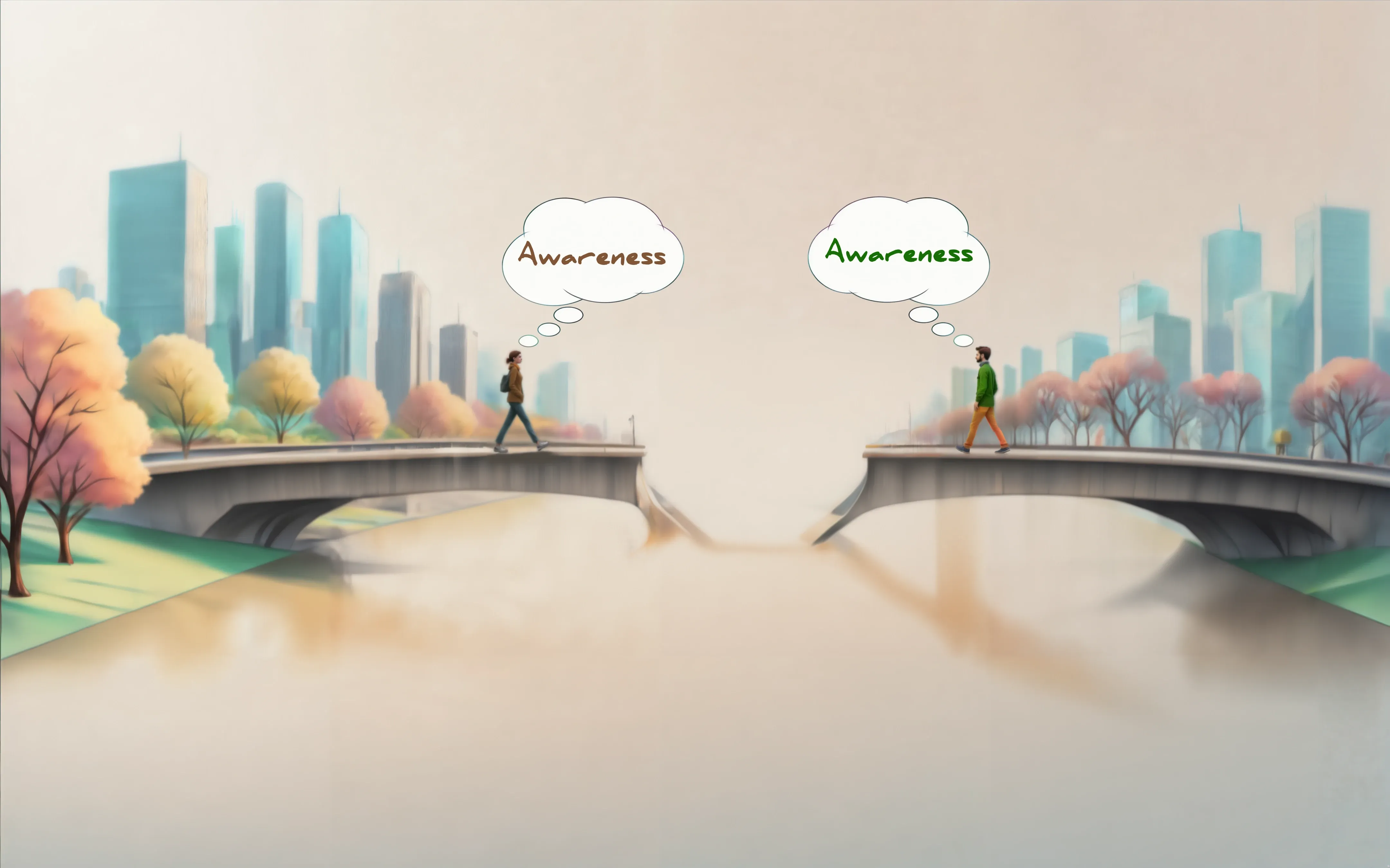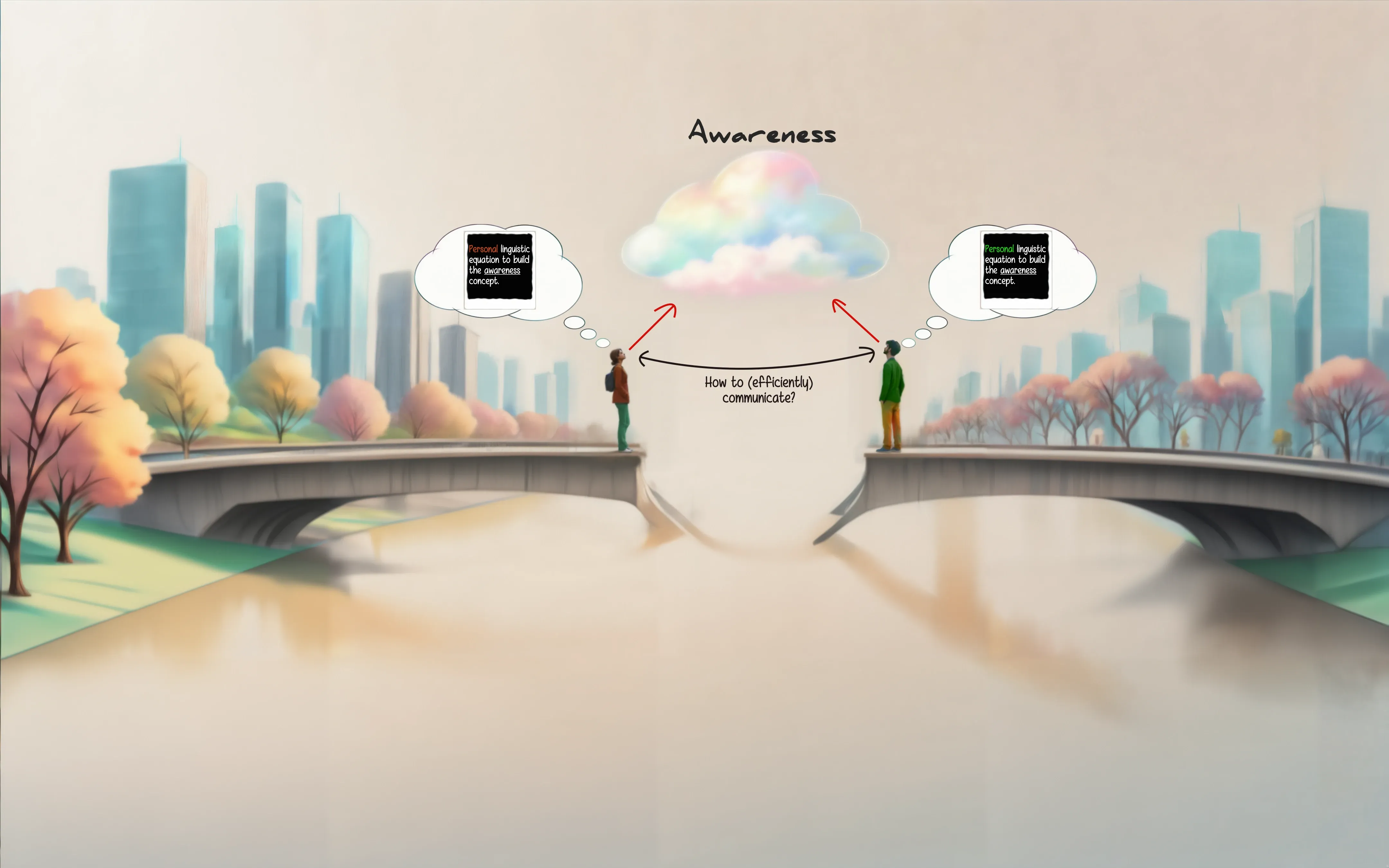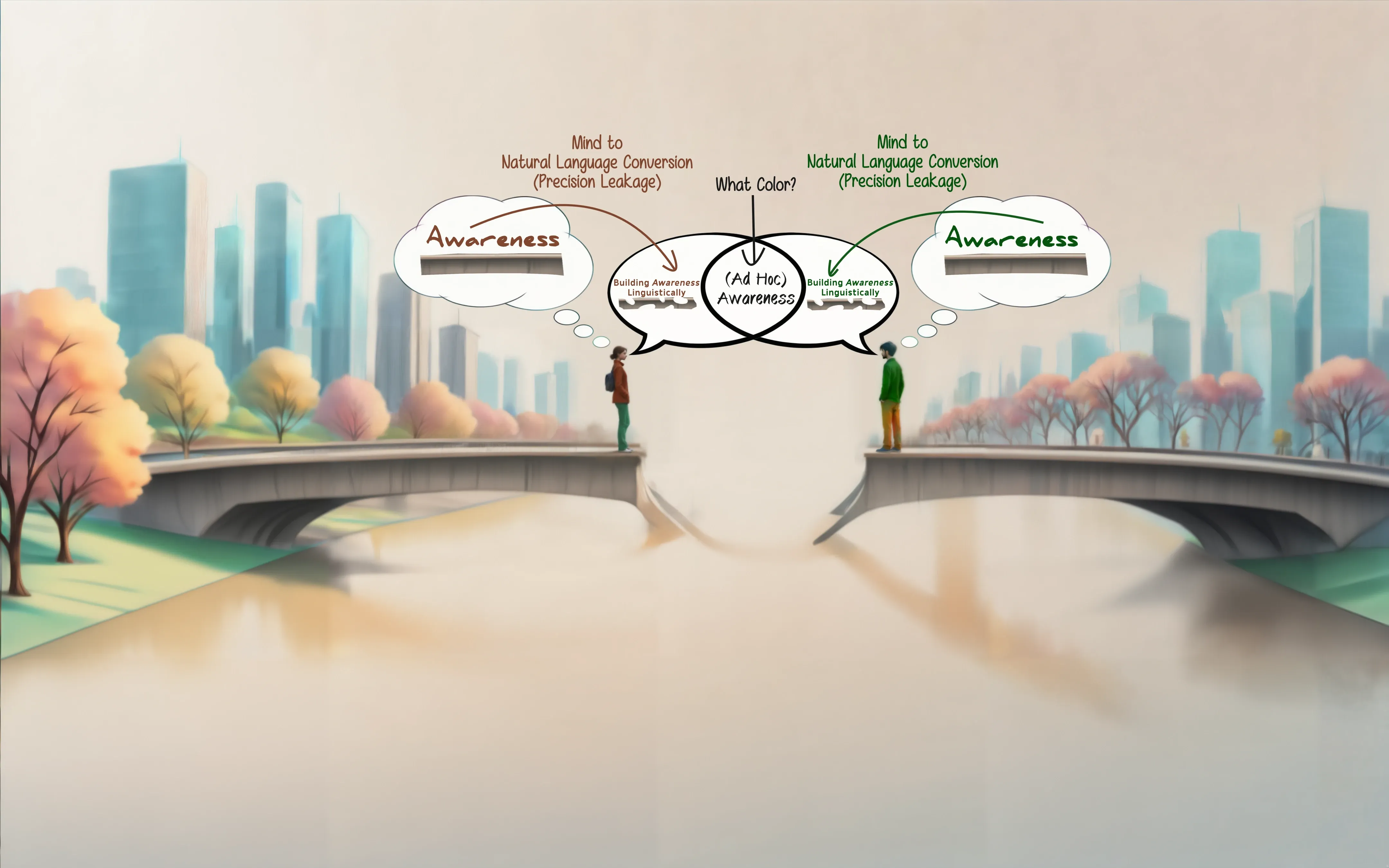 This one is a little tough to explain, but basically: while we share a physical context (outside), we both have our own understanding of awareness — marked by different colors (as initially also illustrated in Fig. 1). The problem, however, is that the physical context isn’t precisely captured by the term outside. There are other things such as noises and smells, different colors we perceive etc. that all have an effect on us as we move along that bridge. So every instant has the potential to slightly alter the color of the bricks or building blocks used to construct our current snapshot of awareness and, thus, its color. In other words, we don’t simply store linguistic building blocks in our mind™ where they remain static until we retrieve them. Instead, these blocks affect one another and are in a dynamic relationship with whatever we experience, learn etc. — and that includes the act of communicating with one another. Put simply, as things stand right now, we won’t be able to meet on that bridge.