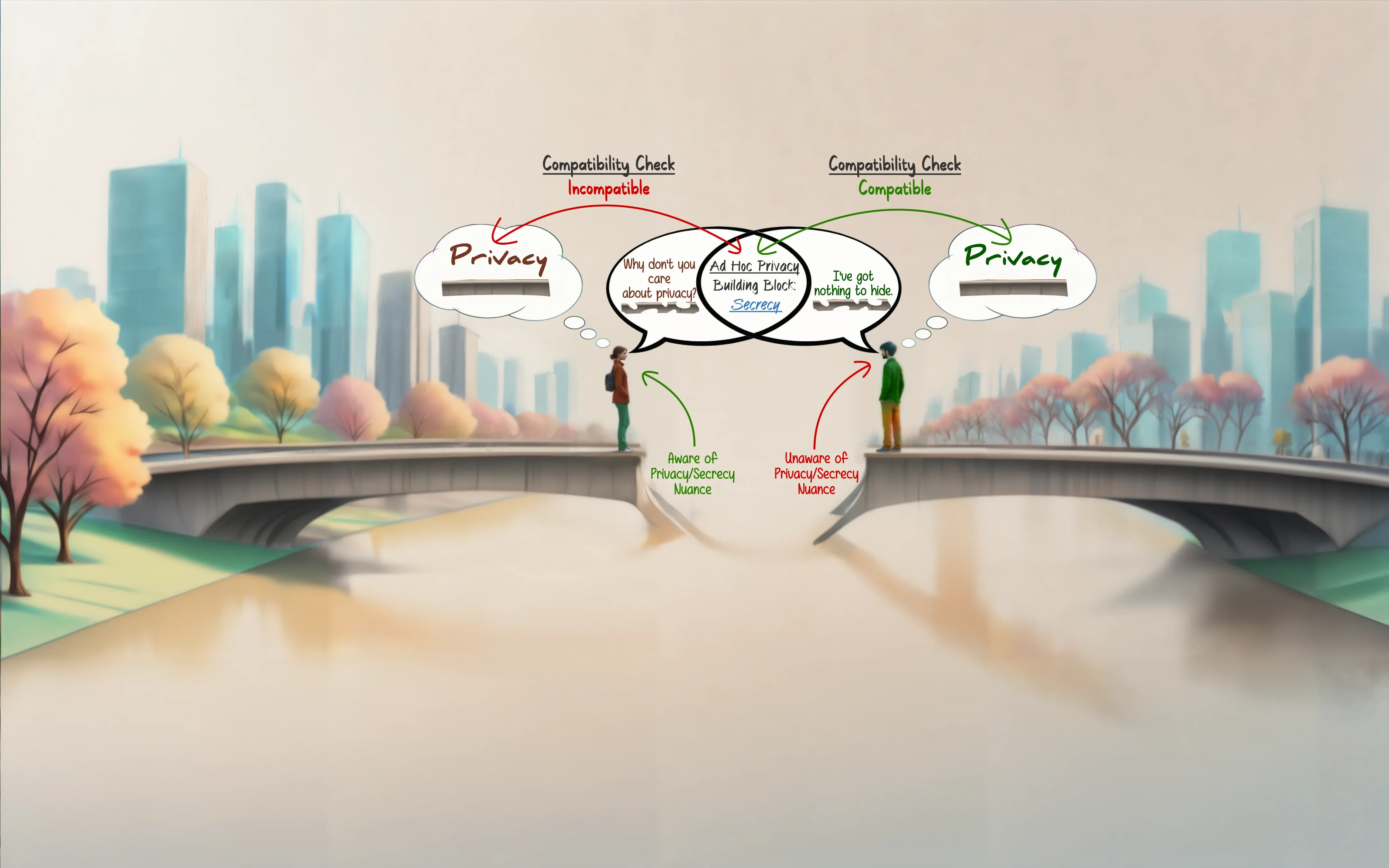 The first thing to point out is that full compatibility doesn’t depend on high linguistic accuracy — nor does it require our conceptual understanding of awareness to be grounded in some sort of accepted reality by other people. As long as our ad hoc concept is compatible both with your understanding of awareness as well as mine, we’re ready to bridge that gap — regardless of whether we actually know what we’re talking about. Here’s an example using the privacy concept to make this a little less abstract: