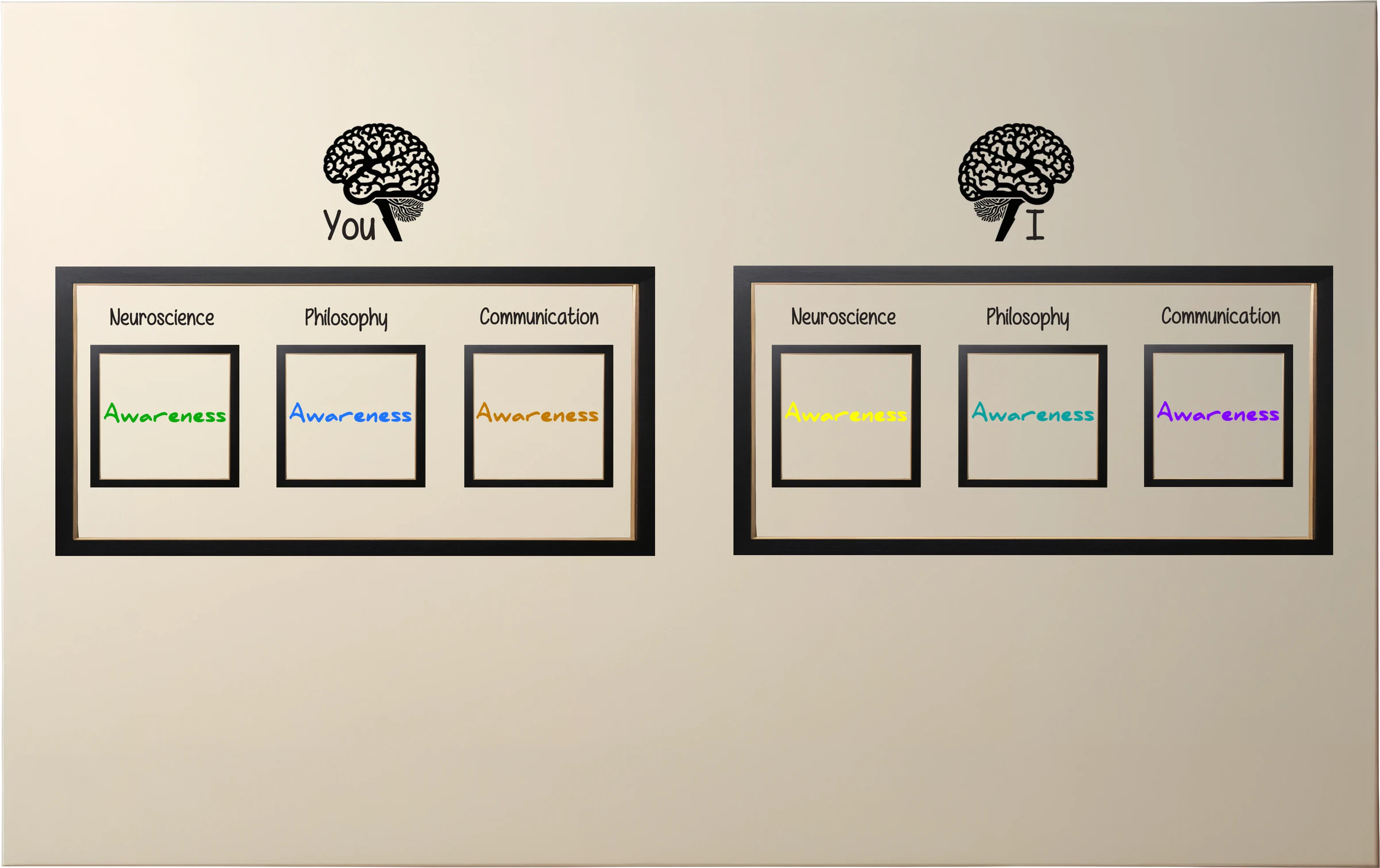 Now, you might wonder: shouldn’t Neuroscience, Philosophy and Communication be framed in different shapes (or colors) as well? After all, they’re probably not exactly the same either — depending on whether the perspective is yours or mine. And of course, You and I are obviously different, making it clear that the context isn’t the same, right?