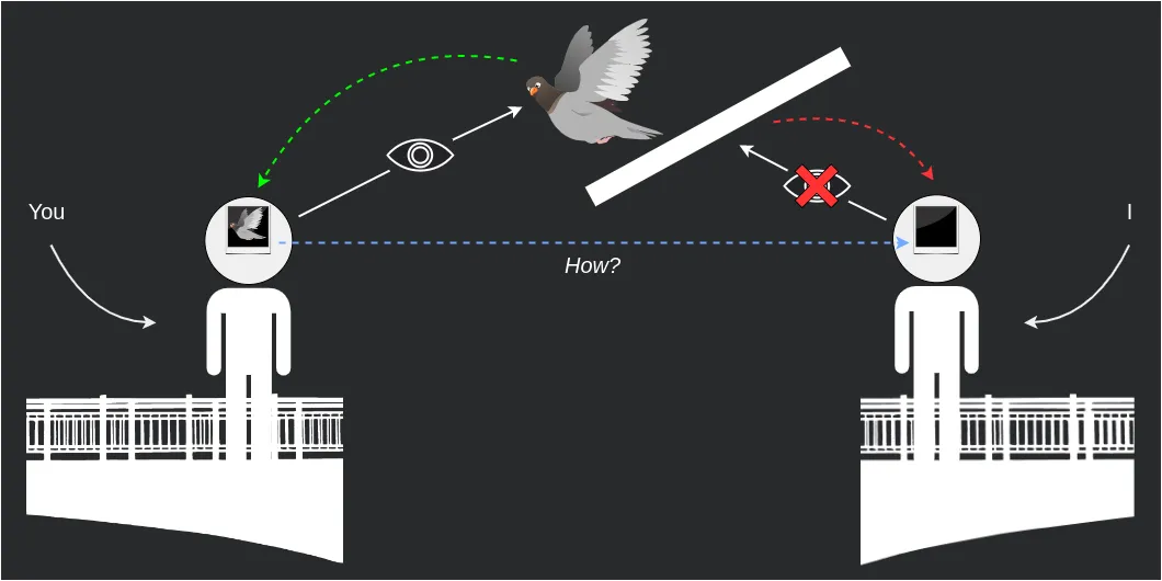 So what’s next? A dead end isn’t the end of the journey — just a reminder to look elsewhere for a way forward. Or as Participant E suggests: we could change the perspective. For instance, how about tweaking the situation depicted in Fig. 13 to make it a little more specific. In other words, two completely blind people won’t be able to visually describe what they cannot see, but how about something a little less extreme?